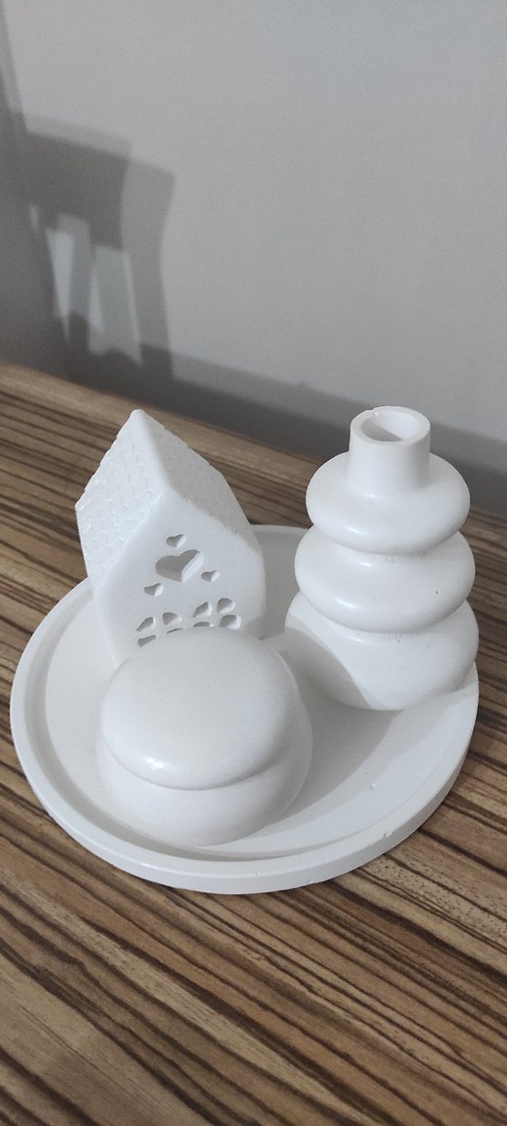 Yuvarlak taban üzerinde farklı şekillerde üç beyaz mumluk içeren dekoratif aydınlatma seti. ️