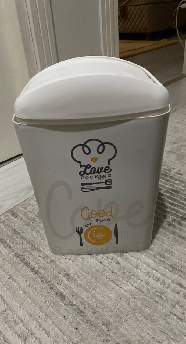 Pastel beyaz renkte, kapağı ve "Love Cooking" ile "Good Food" yazılı mutfak temalı baskısı bulunan çöp kutusudur. Mutfakta atık yönetimi için uygundur. ️