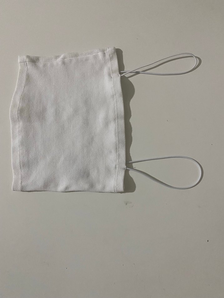 Beyaz, desensiz mutfak önlüğü, gri elastik bantlarla rahat kullanım sağlar.