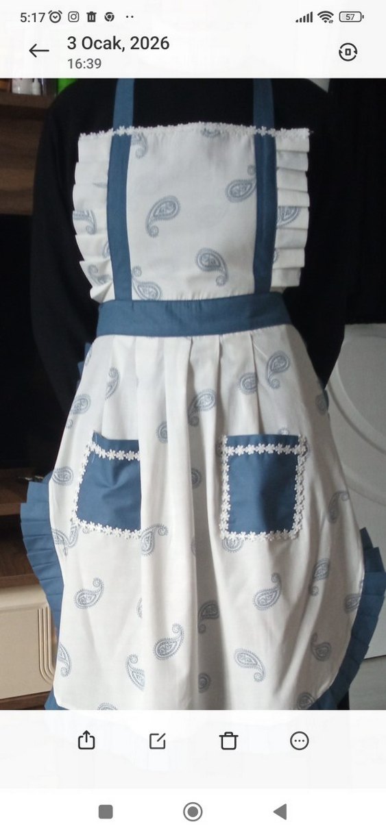 Beyaz mutfak önlüğü, mavi- cepler ve beyaz detaylı. Yanlarda fırfırlı, ayarlanabilir askılı.