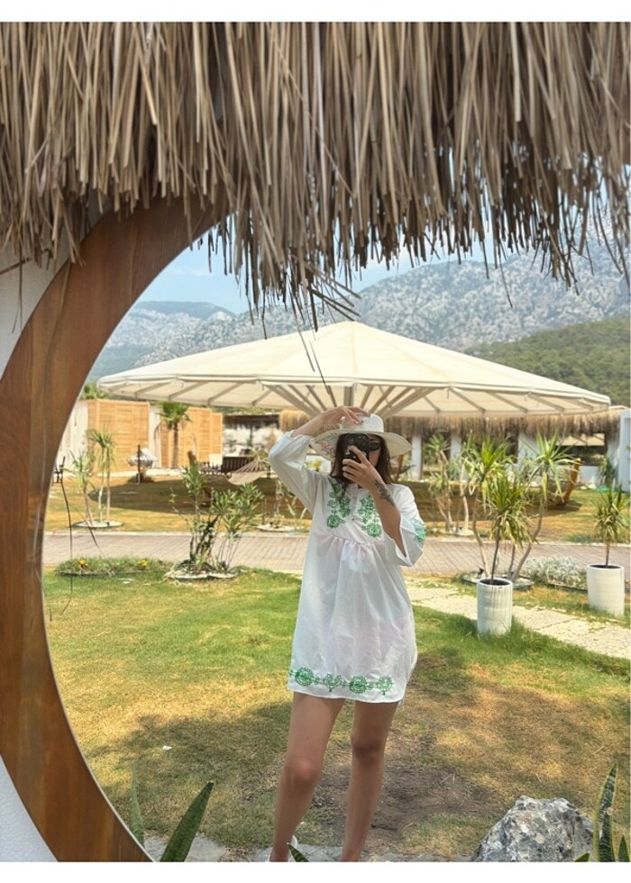 Bikini mayo üstüne çok rahat sahil giyim iç gösteriri çünkü bikini mayo üstüne giyilir rahat şık tatlı 3 kez gıyıldı hata defo yok ye ey emiz nakış işlemeli