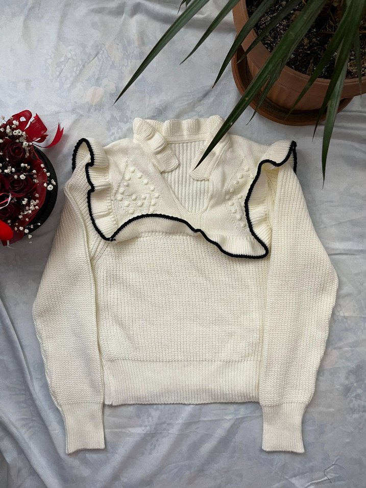 Beyaz, uzun kollu, balıkçı yakalı, nakışlı ve fırfırlı detaylara sahip, dar kesim triko kazak. Rahat sokak stili için uygun.