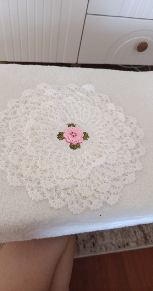 Orta kısmında pembe çiçek nakışı bulunan beyaz, narin tığ işi banyo lifi Yumuşak
