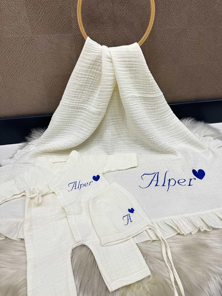 Nakış detaylı, beyaz renkli keten bebek hastane kıyafeti. Üzerinde "Alper" yazısı ve kalp desenleri bulunur. Yumuşak ve rahat kumaş. isim değişikliği yüzünden satmak zorunda kaldım hiç kullanılmadı şapka dahil değildir.