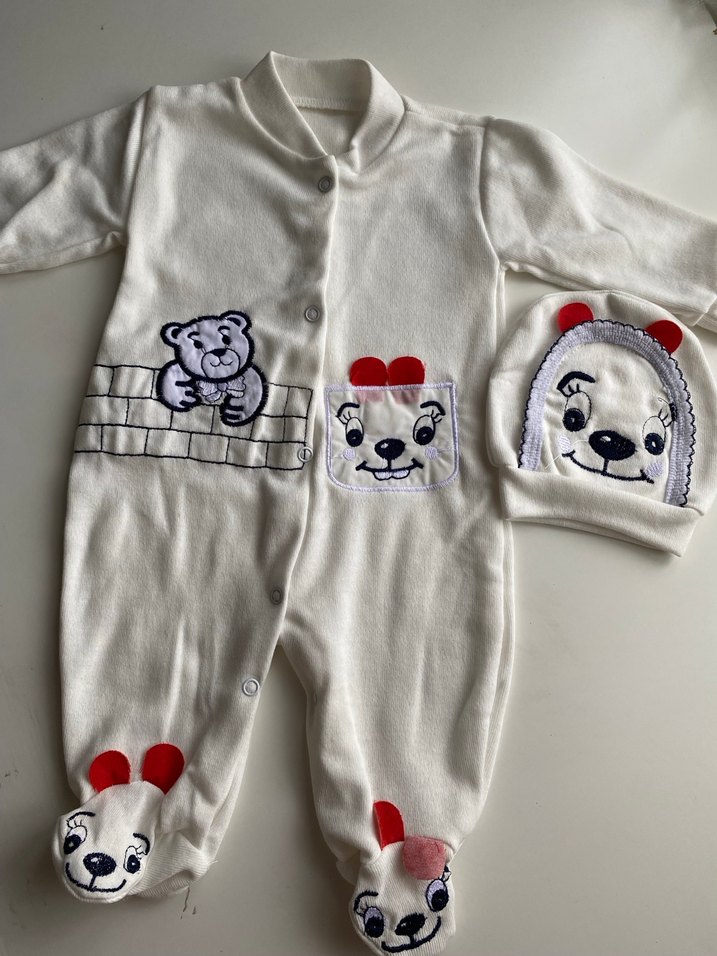 Beyaz Nakışlı Bebek Hastane Tulumu ve Şapka
