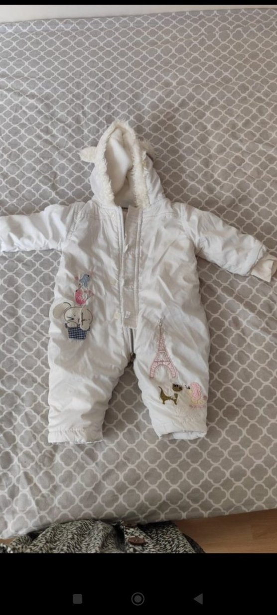 Beyaz renkte, nakışlı ve pastel detaylara sahip, kürklü kapüşonlu ve kesik yaka detaylı bebek kışlık tulumu. ❄️