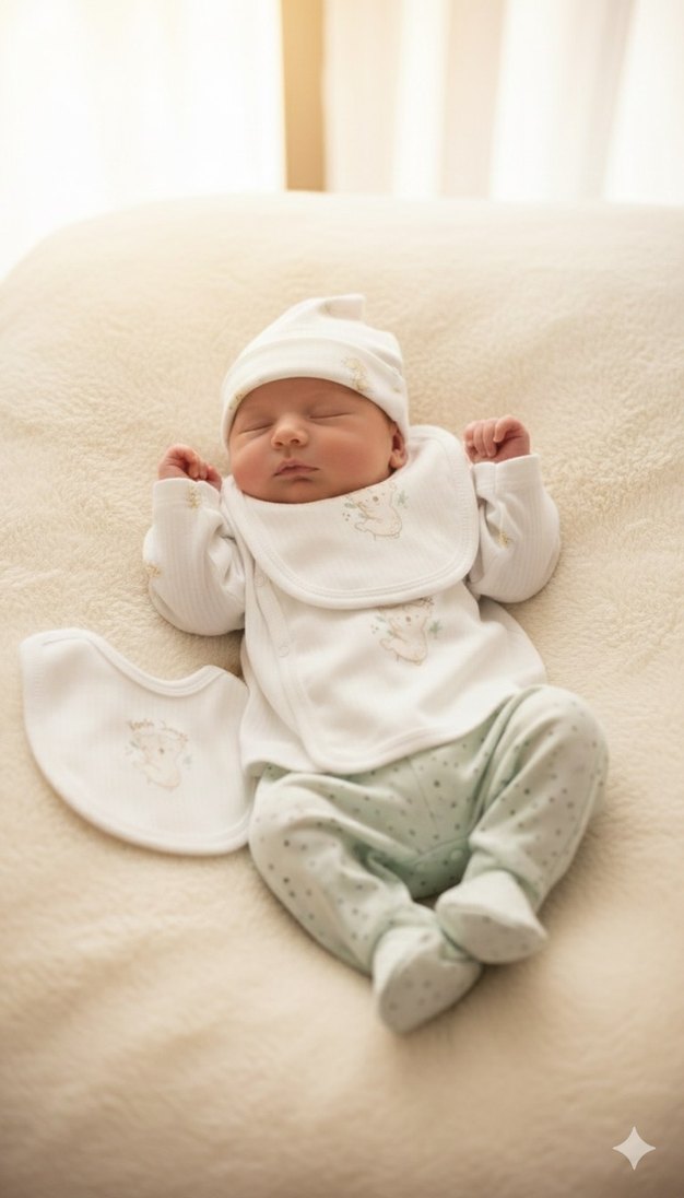 Beyaz renkte, kabarık kollu ve nakışlı detaylara sahip bebek kız hastane kıyafeti. Pastel tonlarda şapka ve önlük ile tamamlanmıştır.