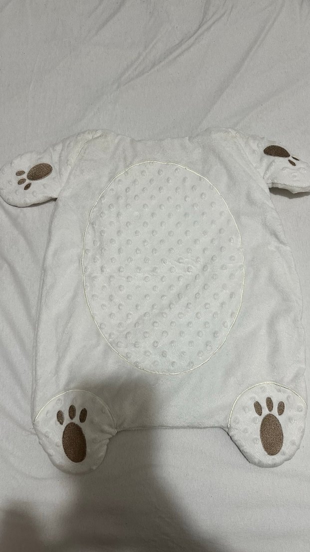 Gri nakışlı pati desenleri ve dokulu ortasıyla yumuşak beyaz bebek uyku yastığı.