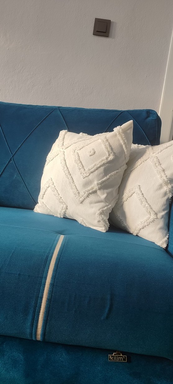 Pastel tonlarda, nakışlı bohem desenlere sahip beyaz yastık, mekana yumuşak ve rahat bir dokunuş katıyor. ️