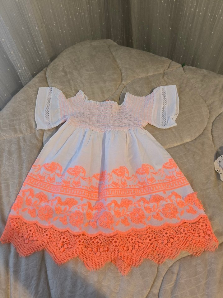 Bu beyaz straplez kız elbisesi, nakış ve dantel detaylarıyla bohem tarzını yansıtır; kısa kollu ve bol kesimdir.