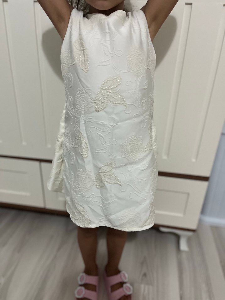 Askısız, kolsuz beyaz elbise, drapeli ve nakışlı desenlerle bohem tarzda, hafif ve bol kesim kumaştan yapılmıştır.