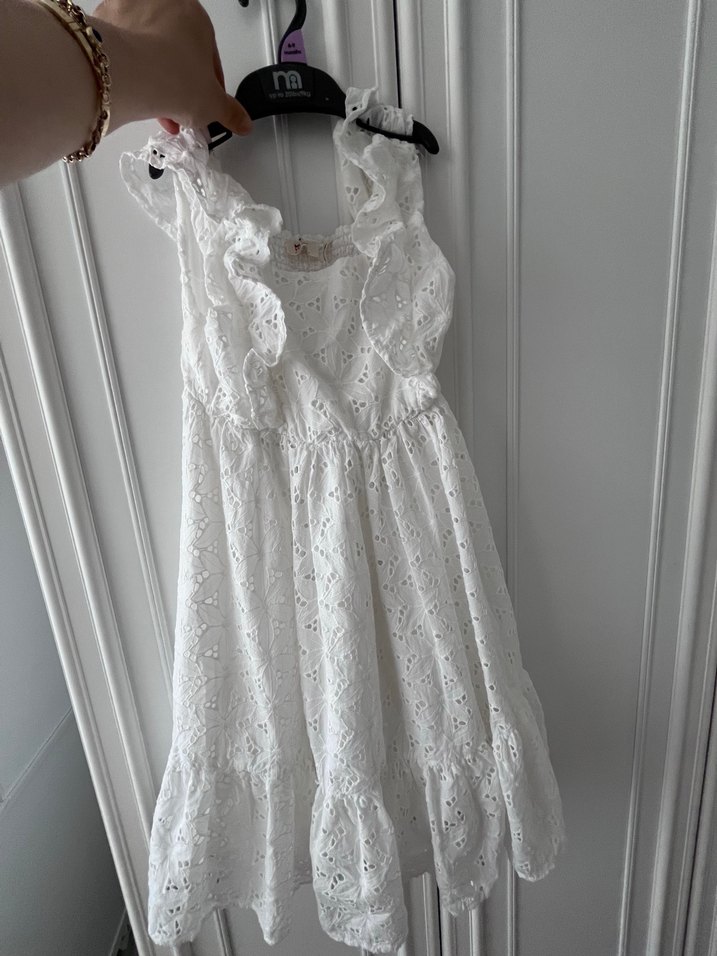 Nakışlı pamuk kumaştan, V yaka, askılı ve fırfırlı detaylı, bol kesim beyaz bohem kız elbisesi.