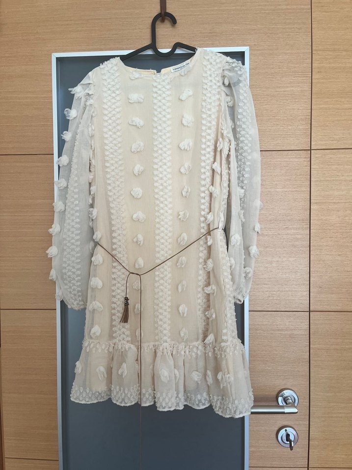 Beyaz renkte, uzun kollu ve nakışlı bohem mini elbise. Püskül detayları ve salaş kesimi ile düğünler için uygundur.
