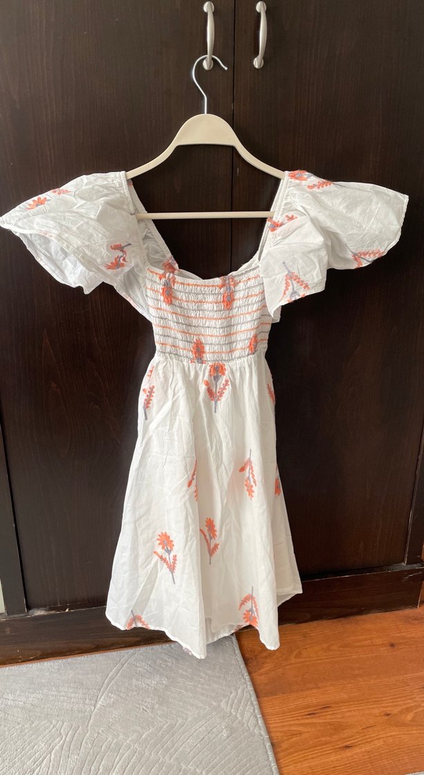 Beyaz nakışlı bohem mini elbise, fırfırlı kısa kollu ve straplez yakalıdır. Yumuşak tekstil kumaştan, bol kesimdir. Günlük kullanım için uygundur.