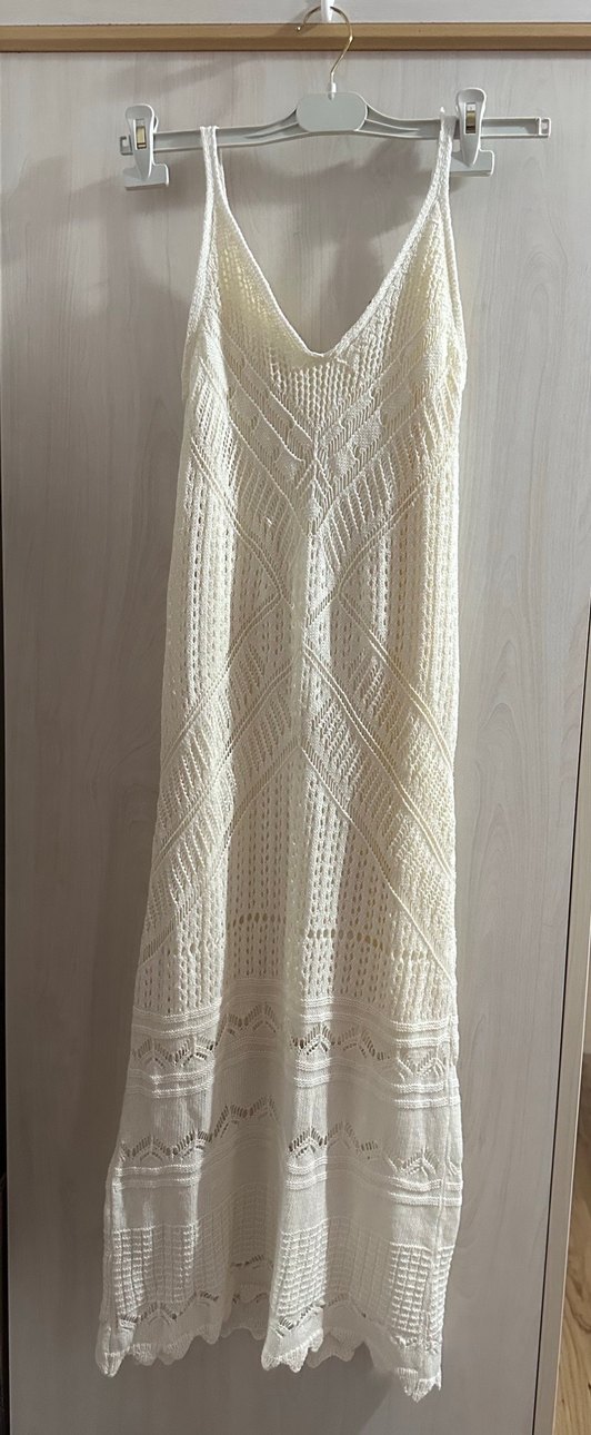 V yaka, nakış detaylı beyaz örgü, askılı ve uzun kesim bohem tarz elbise. Günlük kullanım için uygundur.
