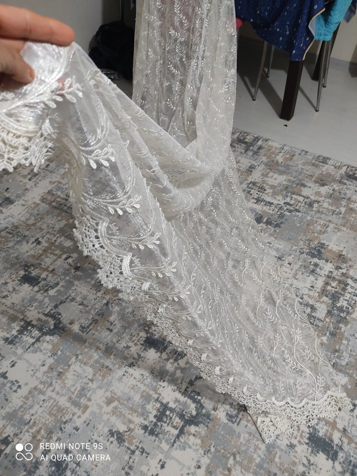 Nakışlı yaprak desenleri ve zarif detaylara sahip beyaz bohem tarzı perde, yumuşak ve akışkan bir dokuya sahiptir. çok ağır dökümlü 2 metre en 2 buçuk metre uzunluğunda Ufak yırtık var ben fark etmedim