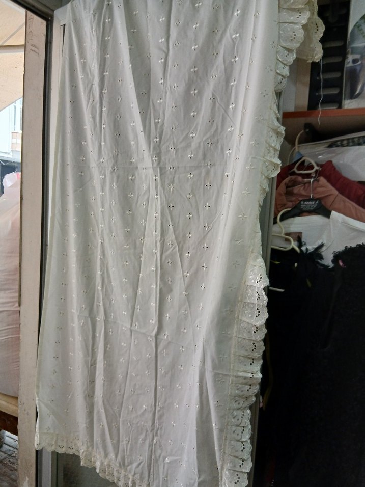 Parlak nakış detaylı, beyaz bohem tarzda perde, narin fırfırlı kenarlarla süslenmiştir. 2 metre 75 cm farbası 95 cm eninde 2 metre boyunda 2 adet perde bir yerinde ocağa yakın olduğu için hafif yanık var resimlerde belirttim 3 parça mutfak perdesi