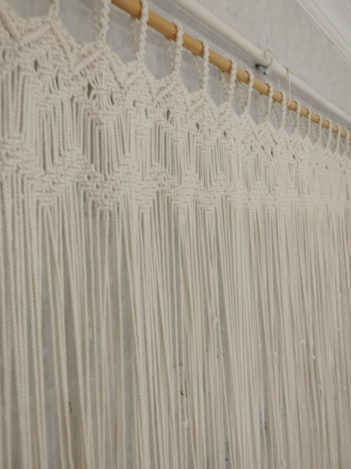 Nakışlı desenli, bohem tarzda beyaz perde, ince makrome detayları ve yumuşak doğal dokusuyla öne çıkar.
