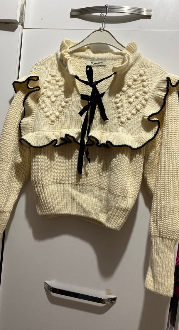 Uzun kollu, yakası fırfırlı ve nakışlı detaylara sahip beyaz triko mini kazak, bohem ve Parisian tarzında günlük kullanıma uygundur.