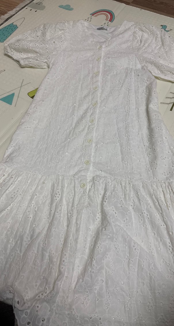 Beyaz, nakışlı ve fırfırlı detaylara sahip bol kesim uzun elbise. Yumuşak keten kumaştan, kısa kollu ve tekne yaka, bohem tarz için uygun.