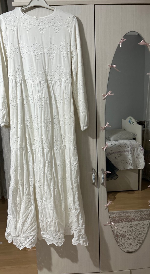 Beyaz uzun elbise, nakışlı desenler ve fırfır detaylara sahiptir. Yumuşak ketenden üretilmiştir, salaş kesim ve kayık yaka ile bohem tarzını yansıtır. 1 kere giyilmiştir iç göstermez fisto elbise