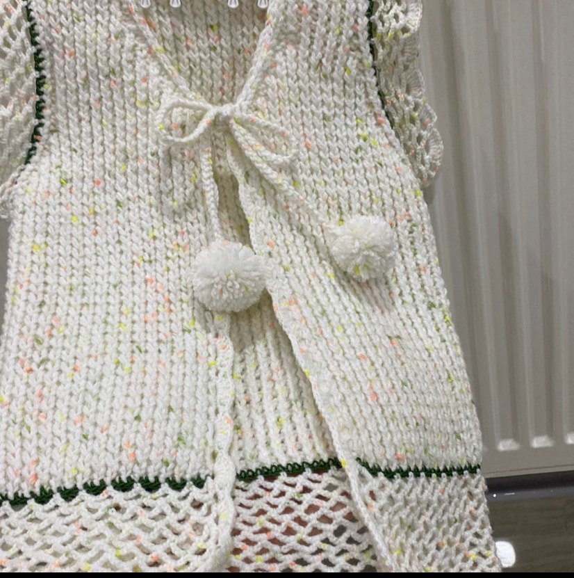 Beyaz, uzun ve bol kesim yelek bohem tarzda nakış detayları ve ponponlu bağcıklarla süslenmiştir. Kız çocuk 3/5 yaşa kadar uygun yeni /ip Ören bayan örnek zırh örgü file ve ponpon ile süslenmiştir,