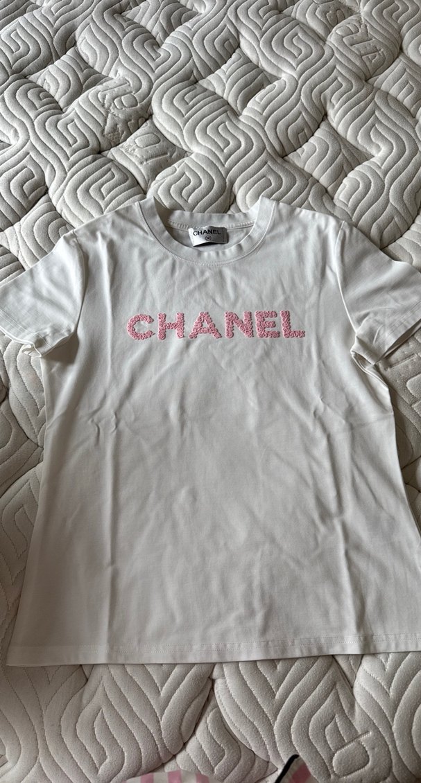 Beyaz, kısa kollu, yuvarlak yaka, pembe payetli "CHANEL" baskılı, yumuşak sentetik kumaştan, dar kesim kadın tişörtü. Ürün orjinal değil