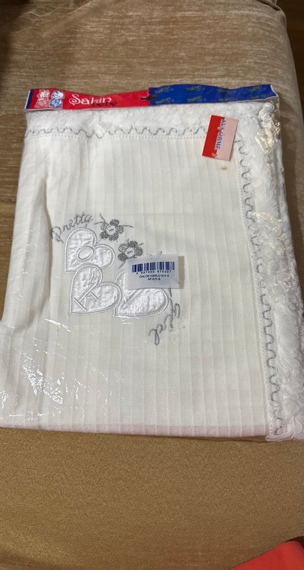 Gri nakışlı kalp desenleri ve kenarlarında süslemeler bulunan beyaz çocuk battaniyesi. Yumuşak ve rahat kumaş.