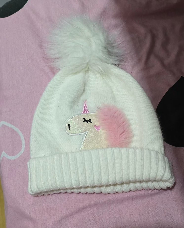Yumuşak ponponlu, nakışlı unicorn desenli beyaz çocuk bere, rahat ve trend bir görünüm sunar.