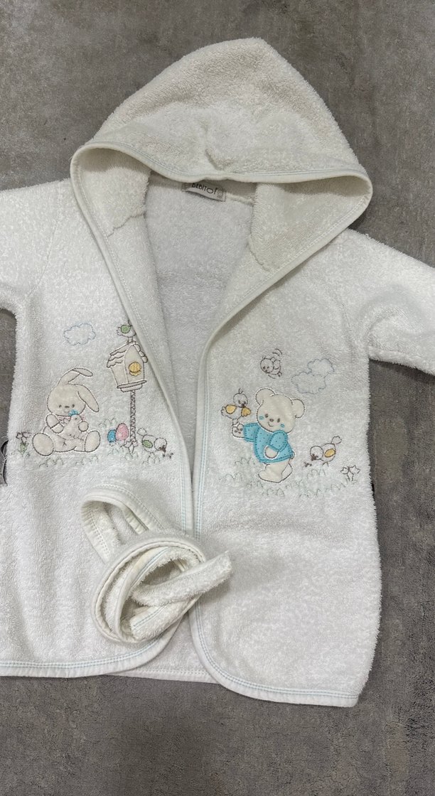 Kapüşonlu beyaz çocuk bornozu, pastel renkli hayvan nakışlarıyla süslenmiş, yumuşak ve emici kumaştan. Kemer dahil. 3,5 yaşa kadar oluyor