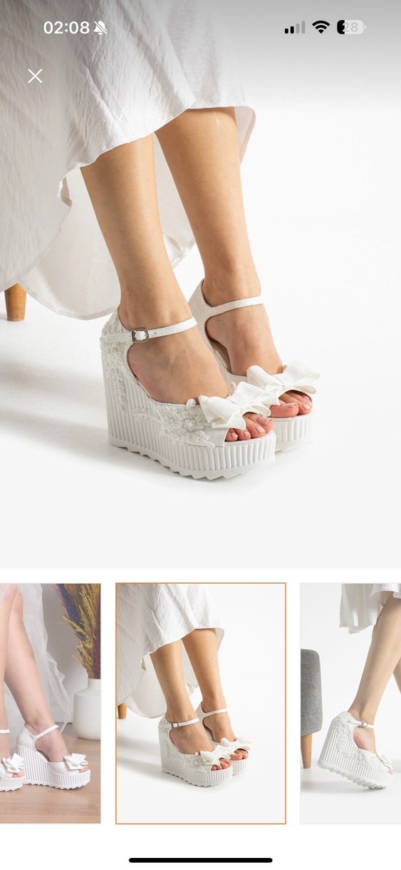 Çok hafif ve asla rahatsız etmiyor. Hiç defosu yok. Nakışlı dantel ve fiyonk detaylı beyaz dolgu topuk gelin ayakkabısı. 37 numara. Yalnızca 1 kere giyildi. 12 cm topuk boyu.