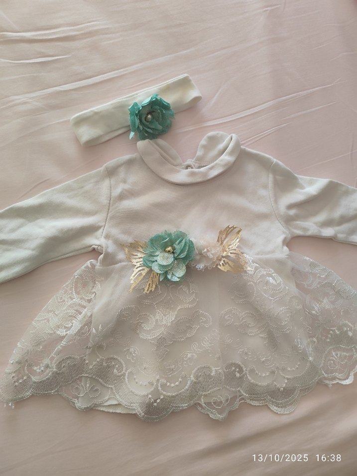 Uzun kollu, beyaz, nakışlı dantel detaylı, straplez yakalı, fitted kesim kız elbisesi. Çiçekli süslemeli uyumlu saç bandı ile birlikte. üst kısimda hiç belli olmayan sariliklar var etiketi yok ama biz 03 ayda kullandık