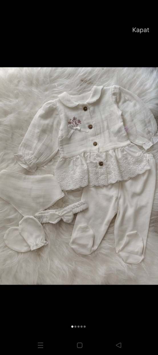 Pastel beyaz renkli, uzun kollu, nakışlı ve dantelli detaylara sahip bebek kız takımıdır. Düğmeli üst, pantolon, eldiven ve saç bandı içerir. müslim kumaş