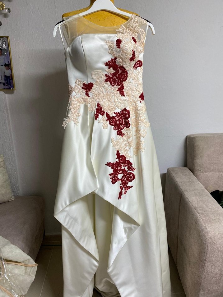 Beyaz renkte, nakışlı kırmızı detaylara sahip straplez, drapeli uzun nişan elbisesidir. Kolsuz ve rahat kesimdir, şık bir görünüme sahiptir.