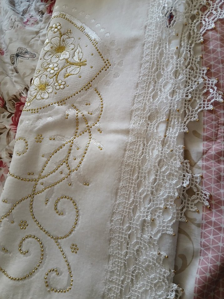 Pırıltılı beyaz renkte, nakışlı çiçek desenleri ve ince dantel kenarlarıyla bohem tarzda