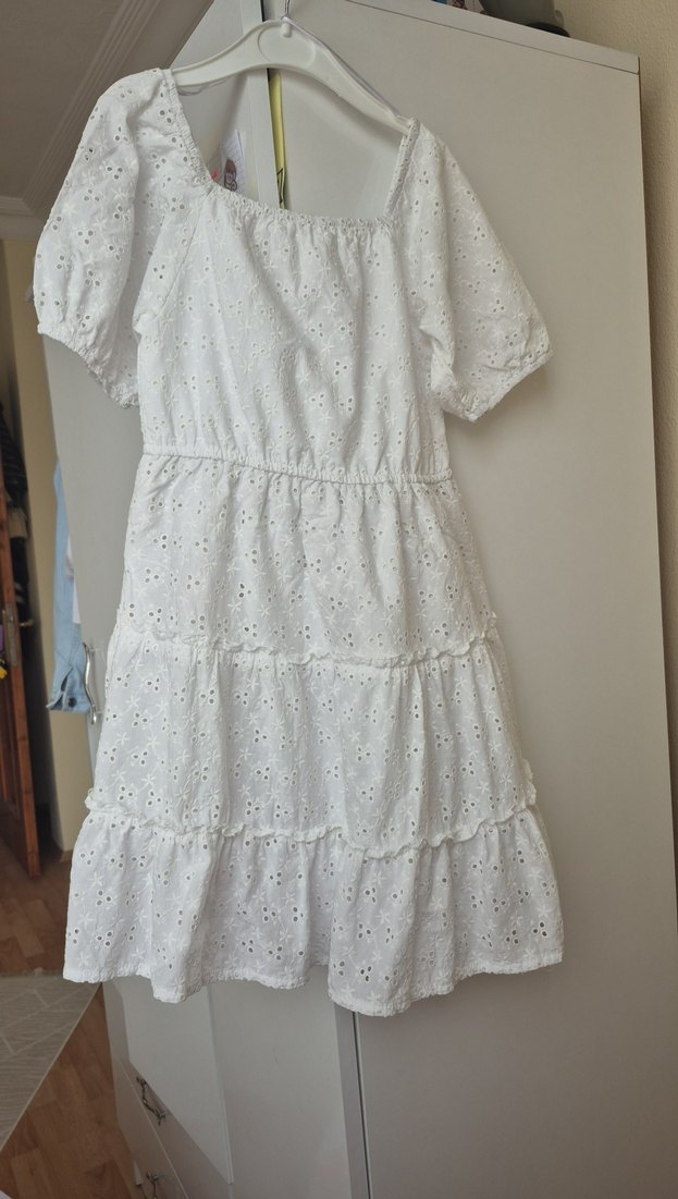 Beyaz pamuk elbise, kısa kollu, tekne yaka ve nakışlı desenlere sahip. Bol kesim ve volan detaylarıyla bohem tarzı yansıtıyor.