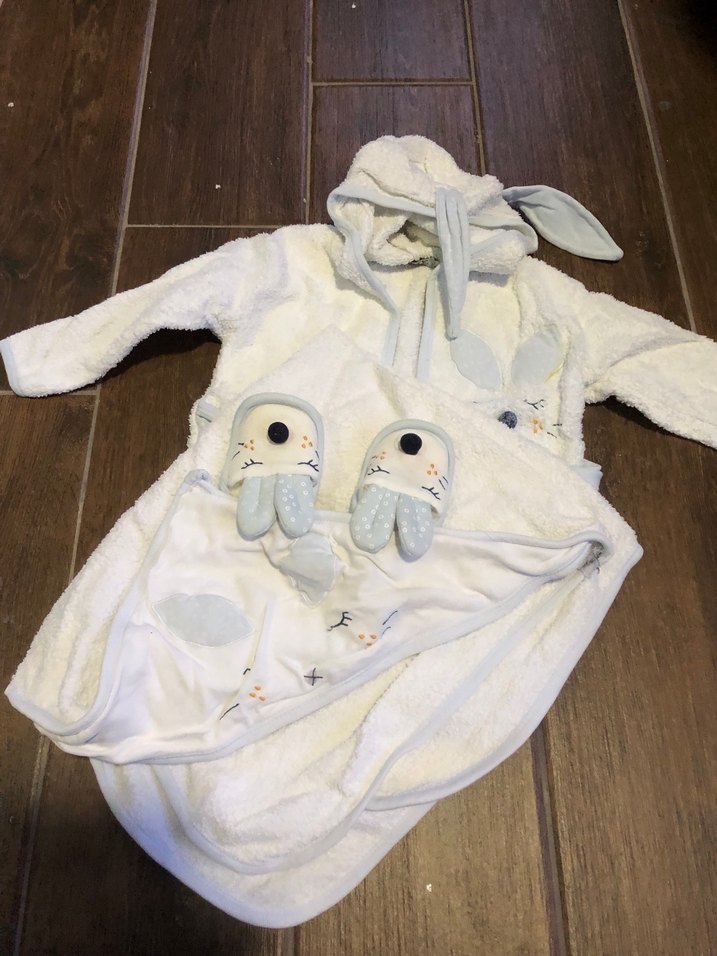 Nakış detaylı kapüşonlu yumuşak beyaz erkek çocuk bornozu ve uyumlu sevimli terlikler seti.