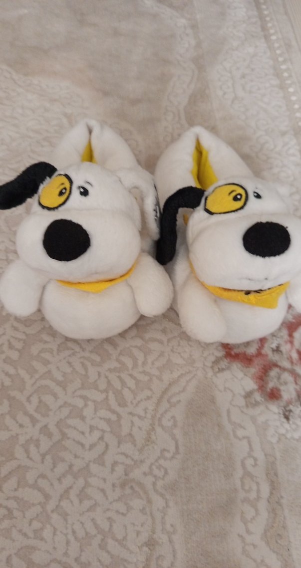 Erkek çocuklar için beyaz, nakışlı köpek desenli, peluş detaylı ve yumuşak kumaştan yapılmış sıcak terlikler.