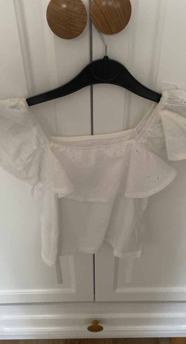 Nakışlı fırfırlı detaylara sahip, beyaz pamuklu, kısa kollu ve kısa boy bohem tarzda bol kesim bluz.