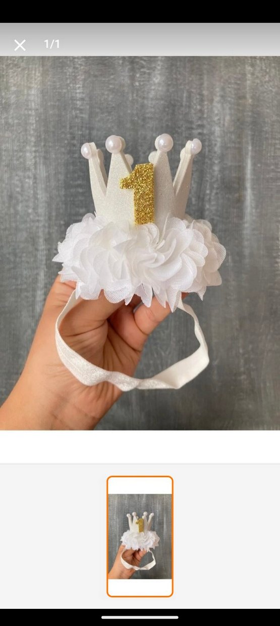 Beyaz nakışlı ve fırfırlı kumaştan yapılmış çocuk tacı, üzerinde simli altın renkli 1 rakamı bulunur. Bohem tarzında, yumuşak ve açık renkler içerir.