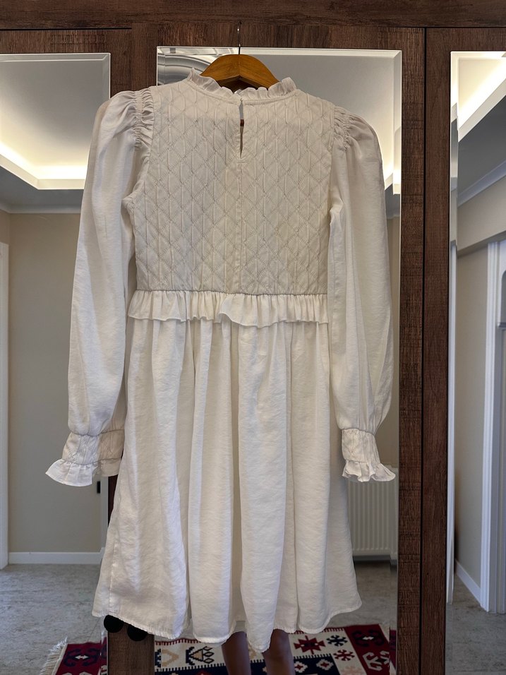 Uzun kollu, yüksek yakalı ve nakışlıdır. Fırfır detaylarıyla bohem tarzda günlük kullanıma uygun