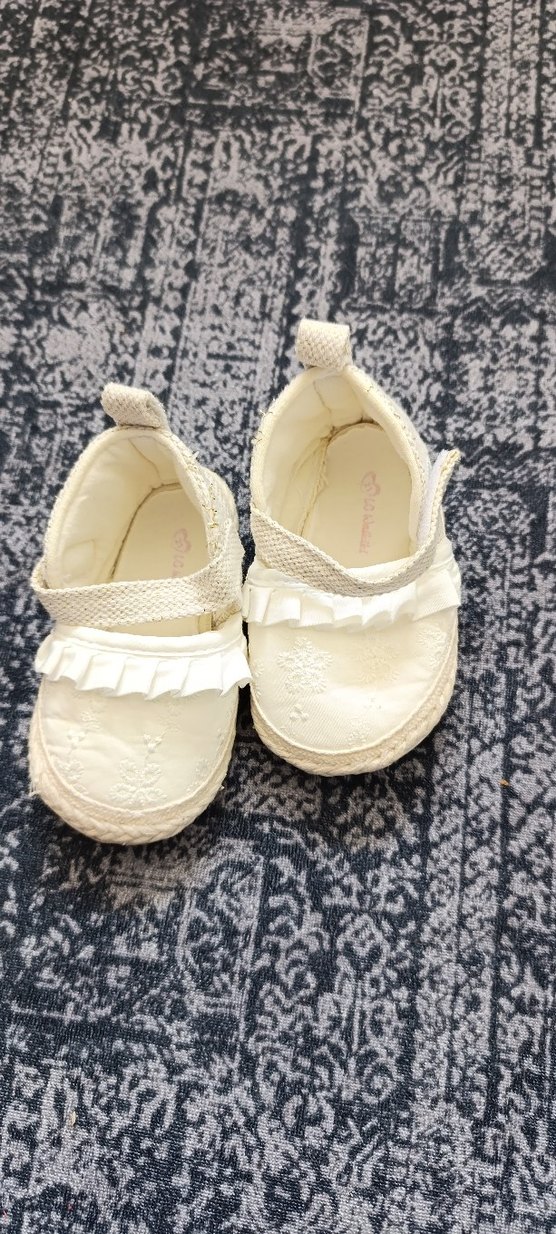 Nakış detaylı ve şık fırfırlı beyaz ilk adım ayakkabısı, rahat kauçuk malzemeden üretilmiştir. Bebekler için uygundur.