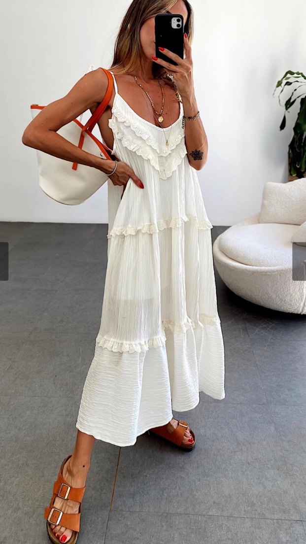 Beyaz renkte, nakışlı ve fırfırlı detaylara sahip uzun bohem elbise. Askılı ve straplez kesimiyle, rahat ve hafif L beden 38-46 arası her bedene olur yeni