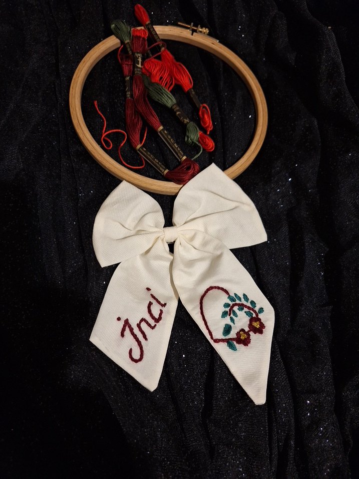 Bordo renkte, nakışlı çiçek ve kalp detaylı bohem tarzda çocuklar için fiyonk saç tokası.