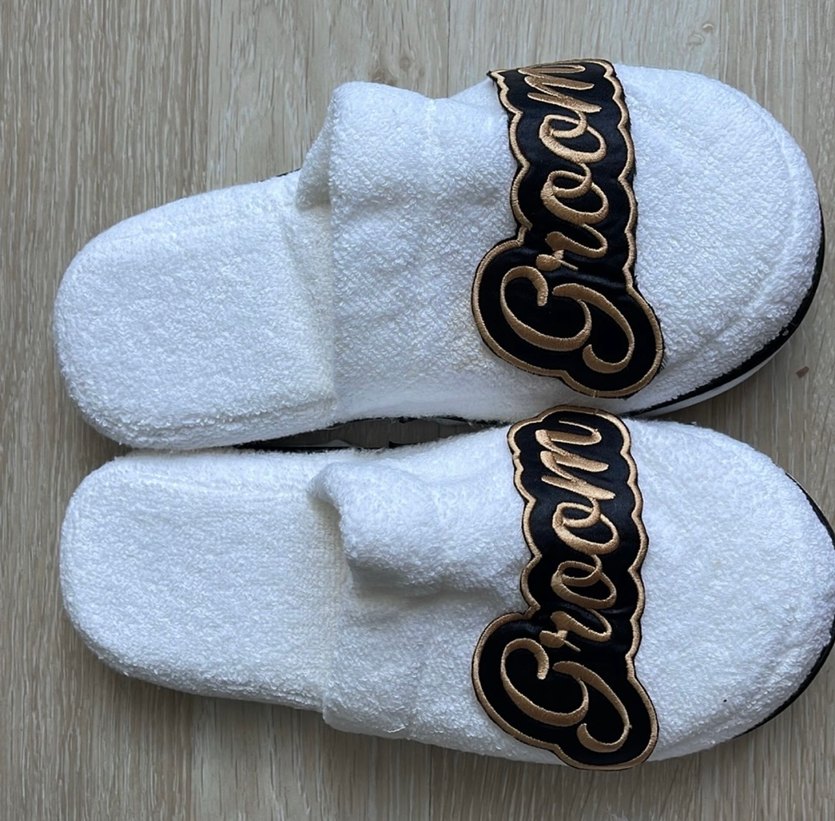 Nakışlı detaylı beyaz gelin damat terlikleri.