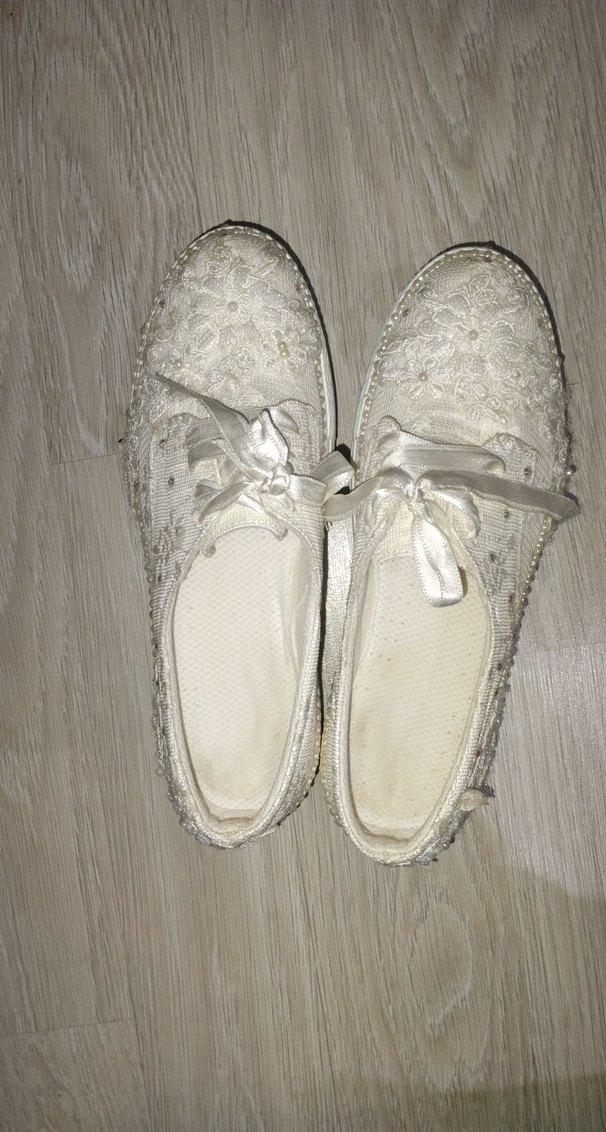 Nakışlı desenlere sahip beyaz dantel ayakkabısı, klasik tarzda ve kabçuk tabanlıdır 38 numara ince taban