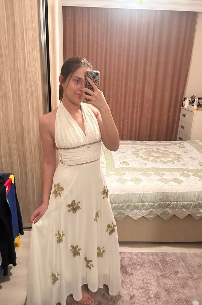 Beyaz abiye elbise, nakışlı çiçek detayları ve drapeli tasarımıyla bohem şıklığı sunar. Nişan, parti, kına vs için ideal, vücuda oturan kesim. helenistik