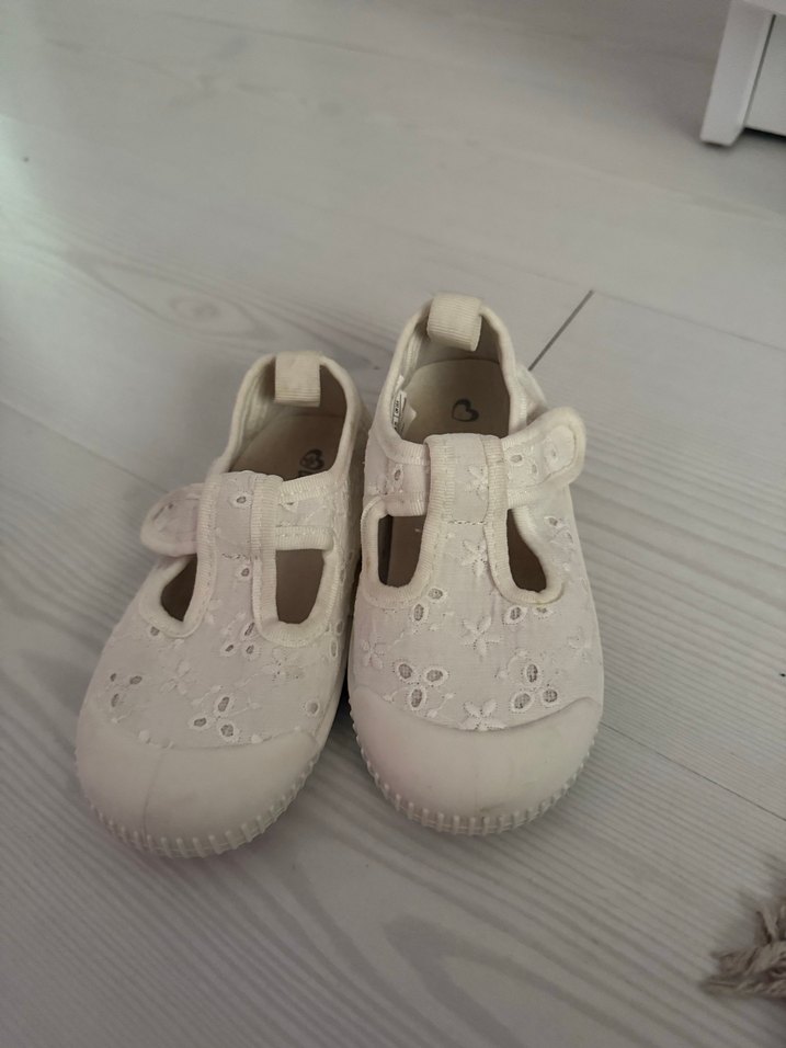 Beyaz nakış desenli ilk adım kız ayakkabısı, kolay kullanım için cırt cırtlı kapanışa sahiptir. Yumuşak kauçuk malzemeden üretilmiş, bohem tarzda rahat bir modeldir.