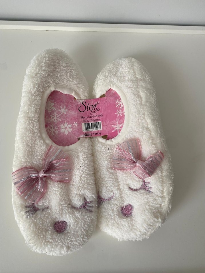 Nakışlı detaylara ve kürk süslemeye sahip beyaz yumuşak kadin ev patigi Pastel renk tonlarında ve sevimli fiyonk detayı bulunur. Marka: Siots.