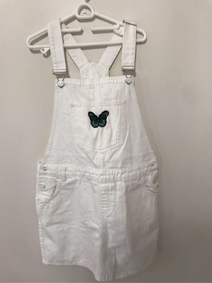 Beyaz, nakışlı kelebek detaylı, düğmeli, askılı, fitted kesim kot şort salopet.